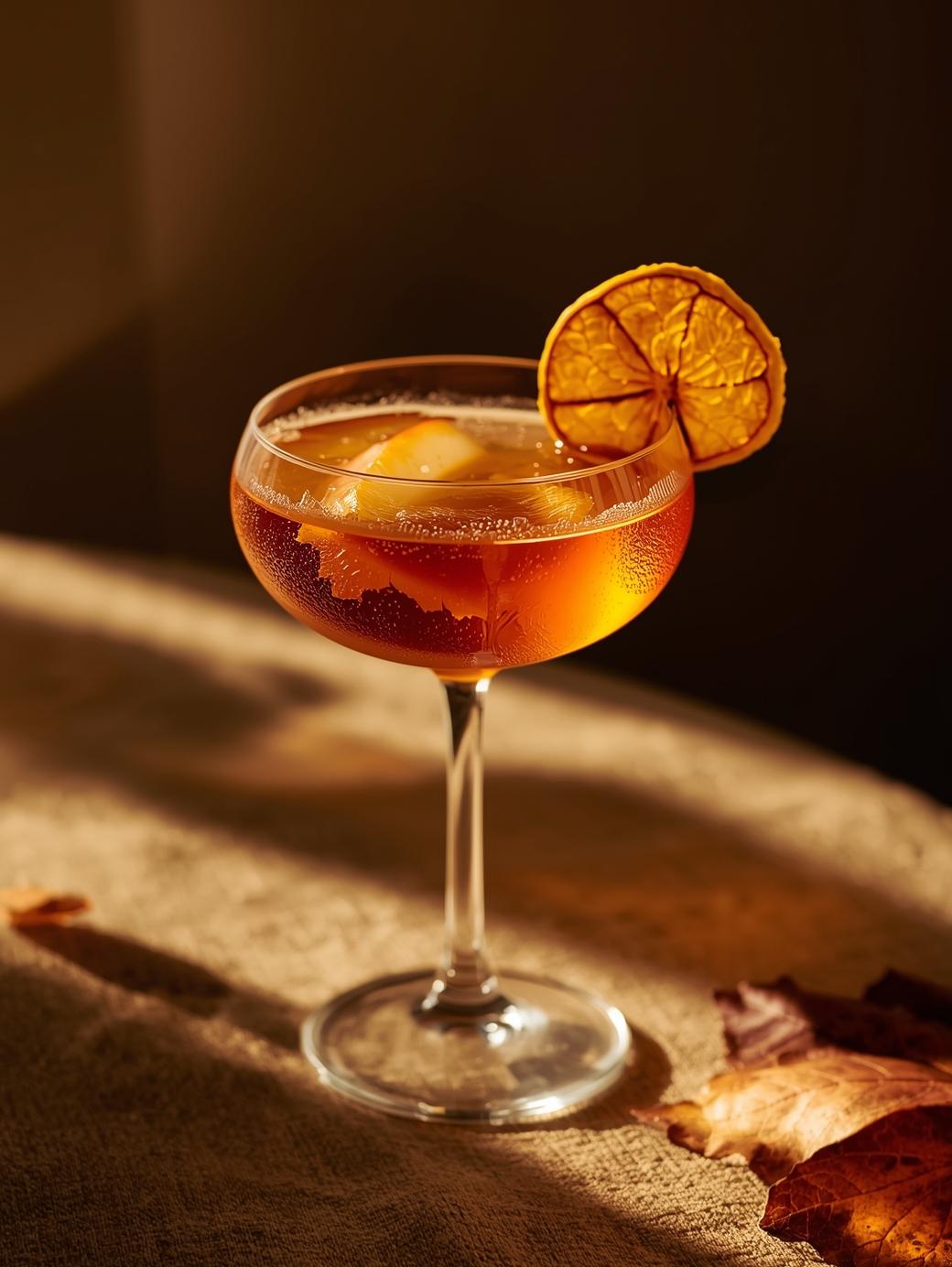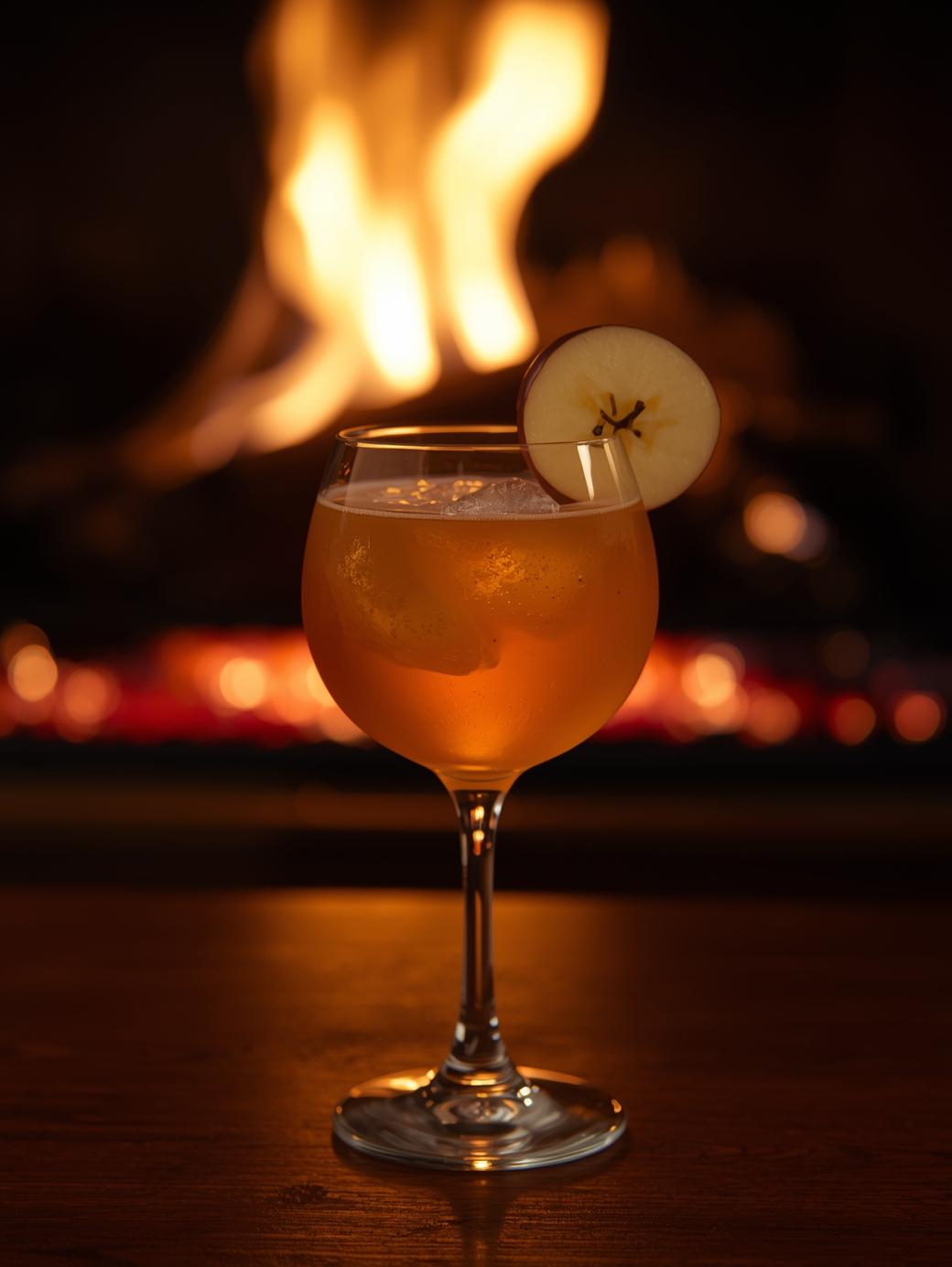 - Garnish with a dehydrated or fresh apple slice clipped to the rim.