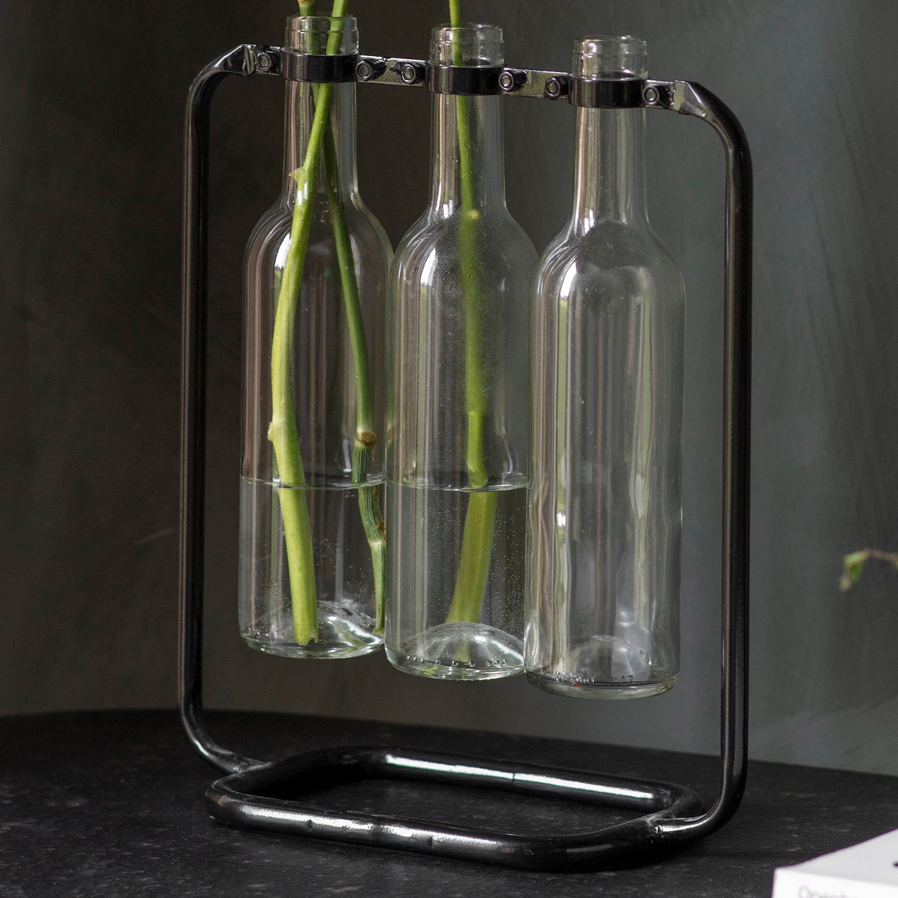 A striking fusion of industrial style and delicate elegance, the Clayton Floating Glass Vases offer a unique way to display fresh or dried stems. Suspended from a sleek iron frame, the trio of glass bottle vases creates a floating effect, adding a touch of modern charm to any space. Perfect for minimal floral arrangements, this piece brings effortless sophistication to tabletops, shelves, or windowsills. Whether styled alone or as part of a decorative arrangement, the Clayton Floating Glass Vases make a beautifully understated statement.