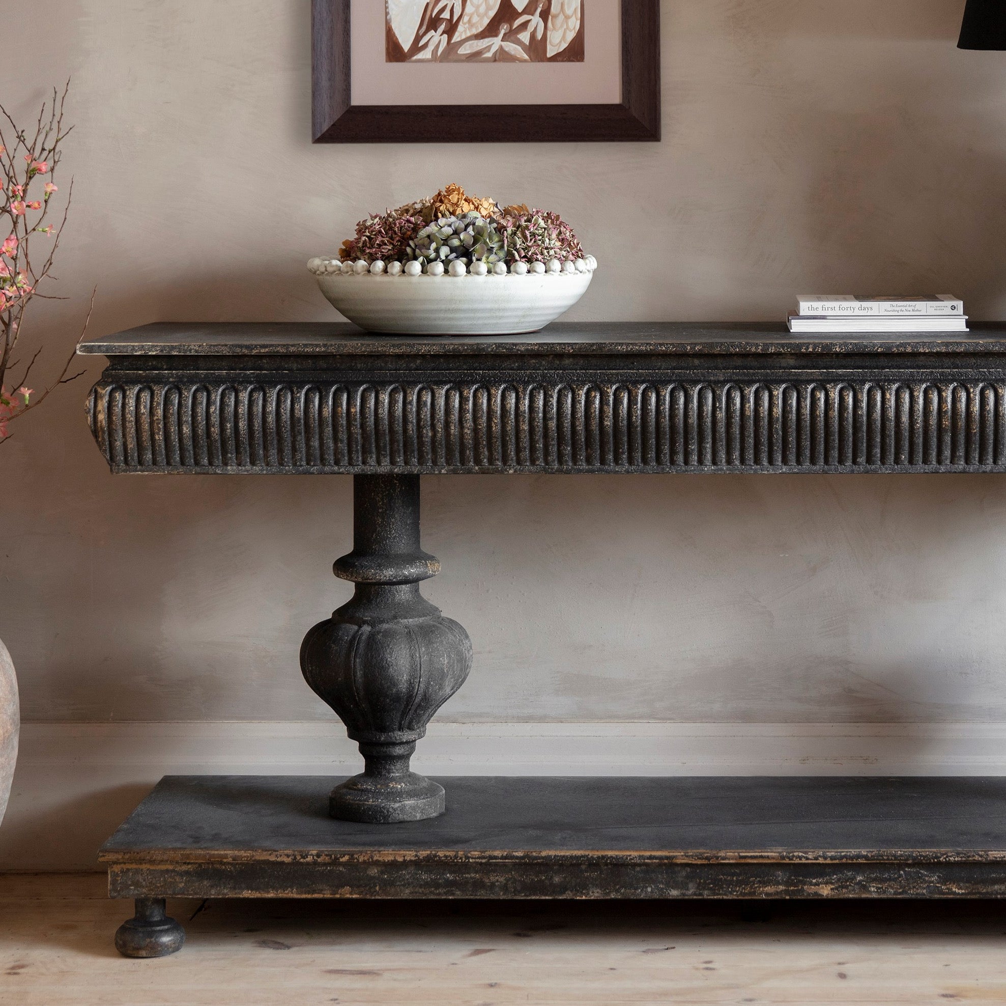 The Clovelly Balustrade Console Table is a striking statement piece that blends classical elegance with rustic charm. Featuring intricately carved baluster-style legs and a beautifully detailed, fluted apron, this table exudes timeless sophistication. The distressed black finish enhances its antique appeal, while the sturdy lower shelf offers both style and practicality. Perfect for hallways, living spaces, or dining areas, this console table adds depth and character to any interior.