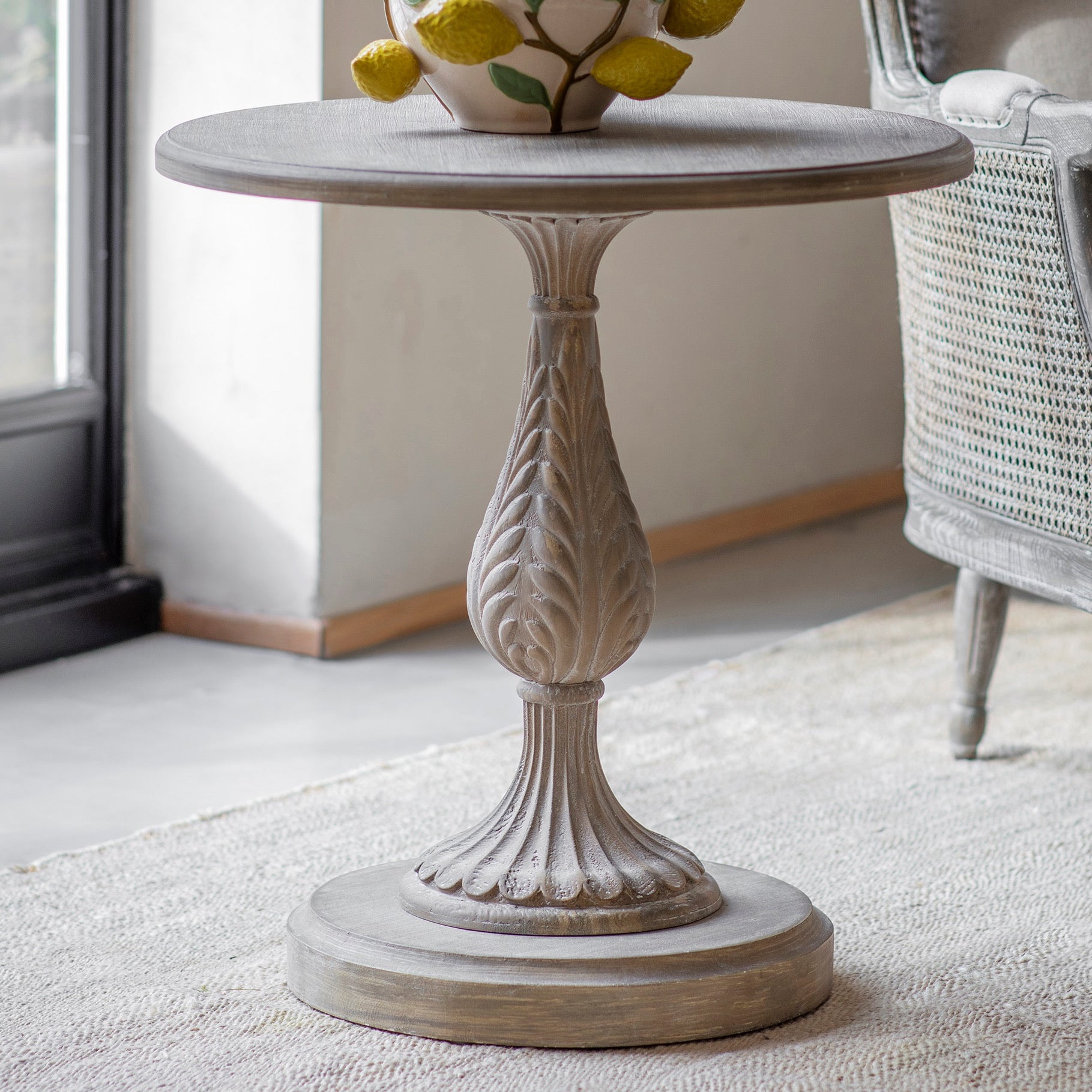 Perfectly ImperfectThe Ilkley Pedestal Side Table is a timeless accent piece with a beautifully carved pedestal base and a gently distressed finish. Its round tabletop offers the perfect spot for displaying décor or resting a drink, while the sturdy design ensures lasting appeal. Blending classic elegance with rustic charm, this versatile table complements both traditional and modern interiors.