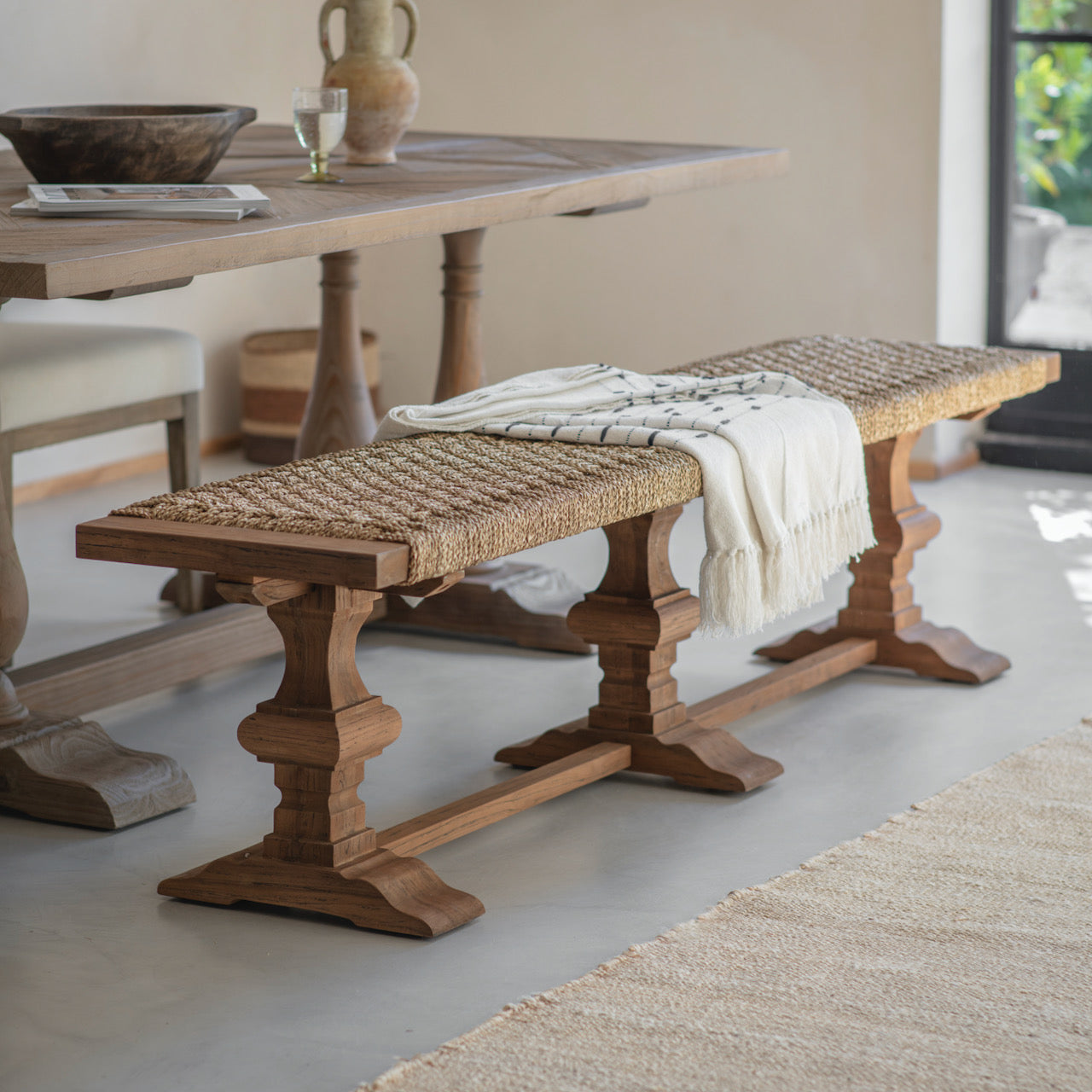 The large Ferndale bench is made from reclaimed teak, rich in natural grain and unique markings that reflect the wood’s past life. Each piece carries its own character, ensuring no two are ever the same. With a textured woven seat and beautifully shaped legs, it blends warmth and timeless style.
