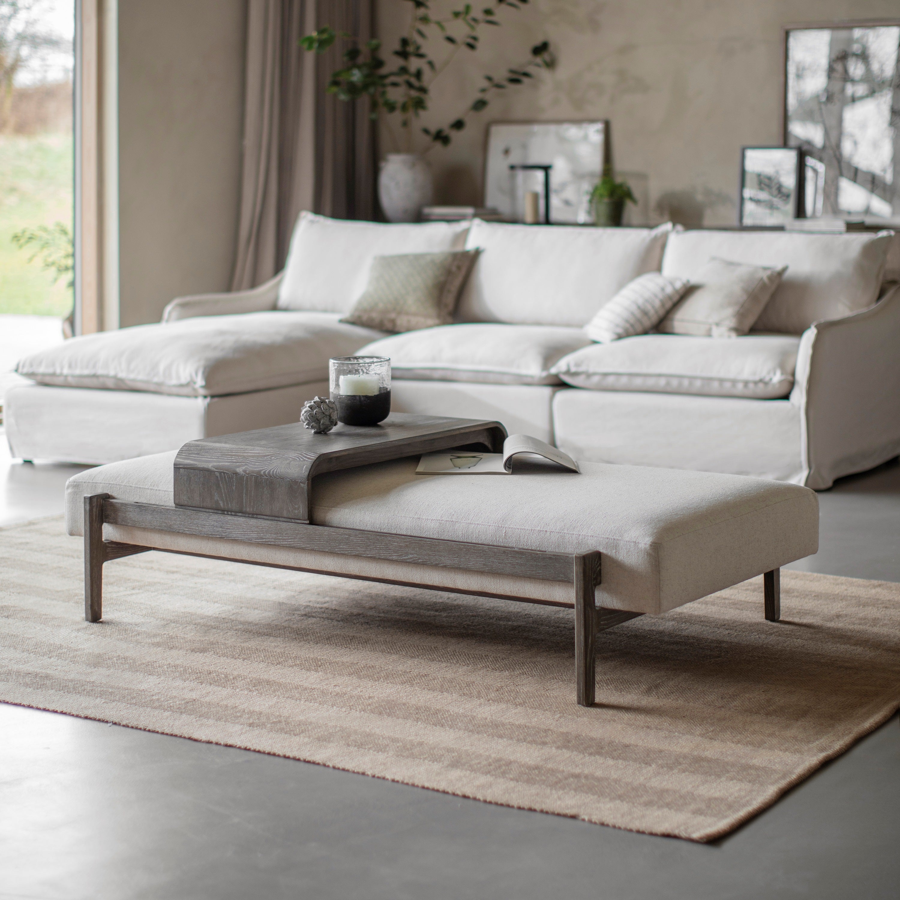Natural TonesA perfect fusion of style and functionality, the Musgrave Ottoman with Sliding Tray is a versatile addition to any living space. Upholstered in a soft neutral fabric, its generously padded top provides a comfortable footrest or extra seating, while the sturdy wooden frame adds a touch of natural elegance. The sleek sliding wooden tray enhances its practicality, effortlessly transforming it into a stylish coffee table for drinks, books, or decorative accents. Ideal for both modern and classic interiors, the Musgrave Ottoman is the ultimate blend of comfort, convenience, and timeless design.