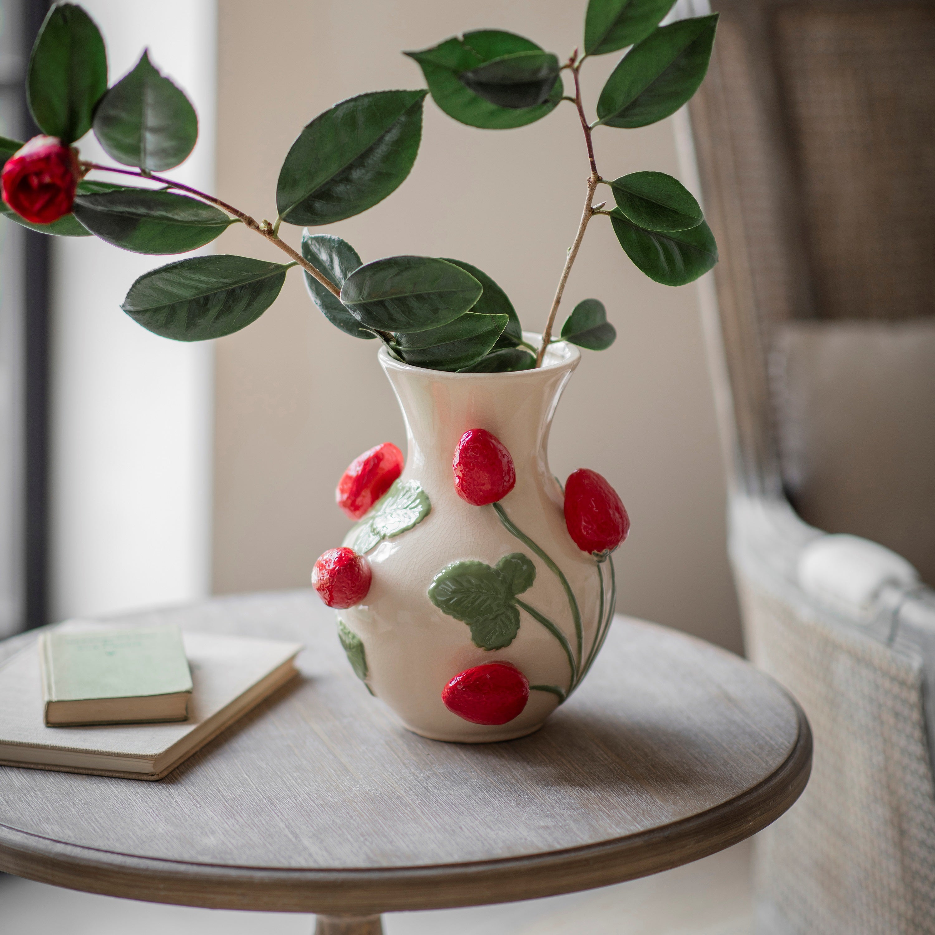 Sweeten up your space with the Portloe Strawberry Vase, a delightful blend of charm and whimsy. Featuring vibrant red hand-painted strawberries and lush green leaves against a soft ceramic base, this eye-catching piece brings a fresh, playful touch to any interior.