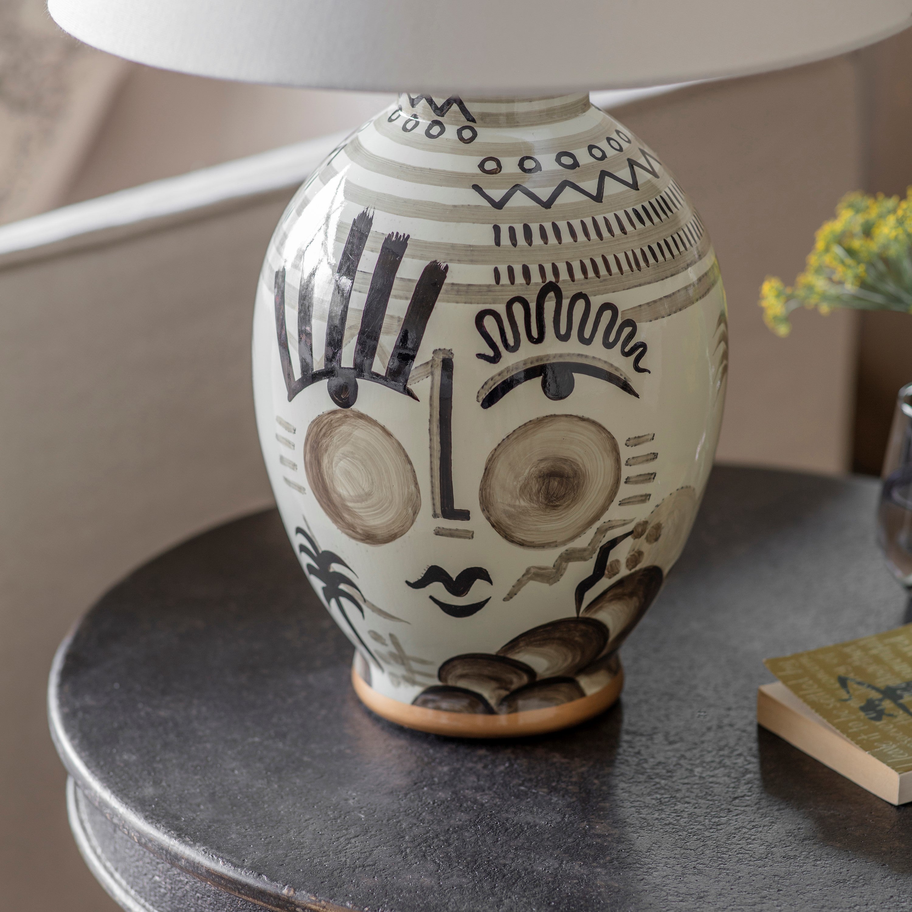 Earthy Neutral TonesThe Wellow Abstract Table Lamp is a striking blend of contemporary design and artistic expression. Its ceramic base showcases a bold abstract face motif with tribal-inspired patterns in earthy, neutral tones, adding depth and character to any space. Accented with a natural wooden base for a subtle rustic touch, it is paired with a crisp white fabric shade that provides a soft, ambient glow. Perfect for eclectic, modern, or bohemian interiors, this lamp is a statement piece that brings creativity and warmth to any setting.